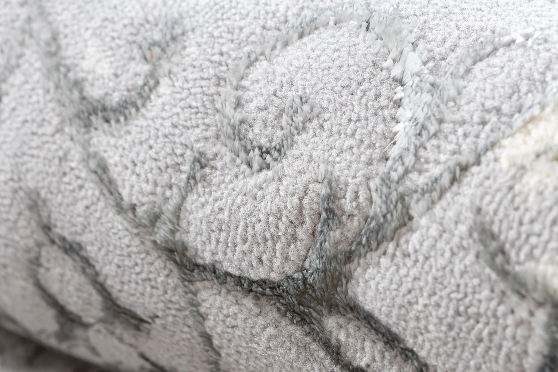 Szary dywan z abstrakcyjnym wzorem rozety, który doskonale sprawdzi się w salonie lub pokoju, dodając wnętrzu nowoczesny charakter.