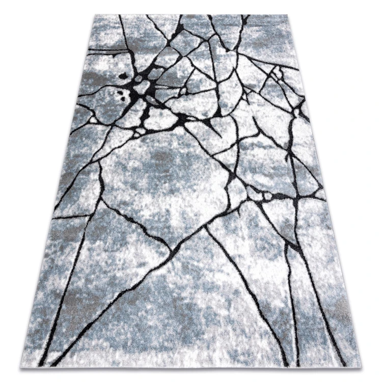 Szary dywan z niebieskimi akcentami i abstrakcyjnym wzorem popękanej powierzchni, który doda salonowi nowoczesny charakter.