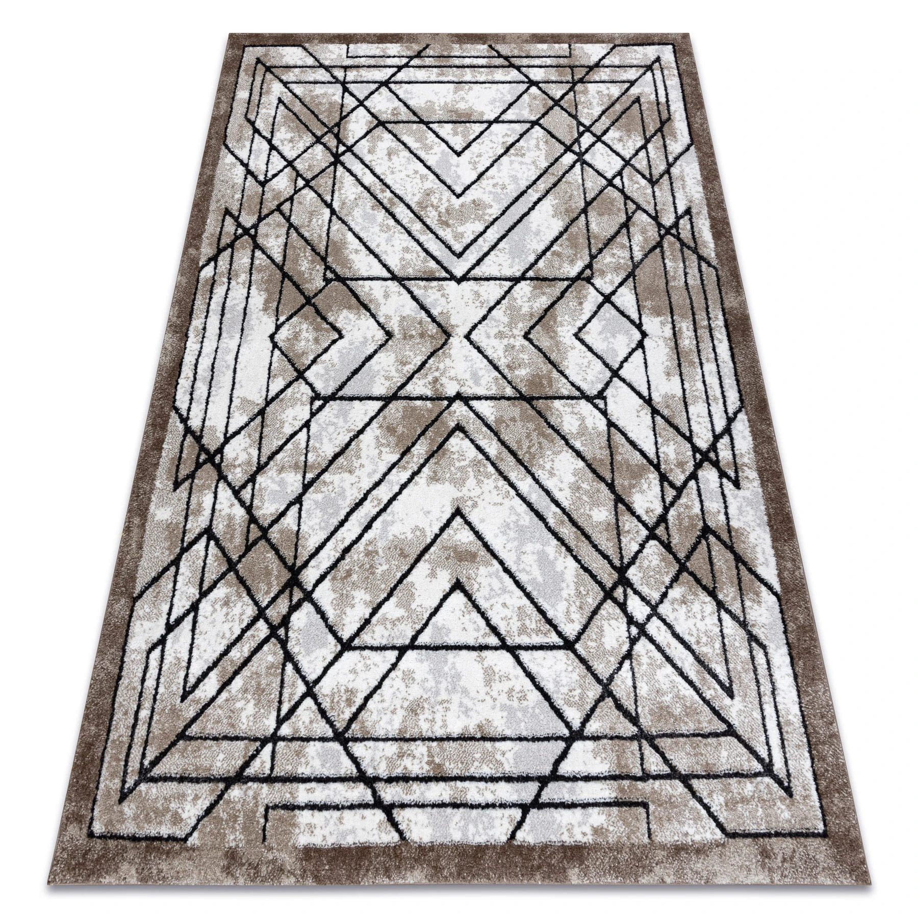 Brązowy dywan z geometrycznym wzorem, który doskonale wpisze się w salon lub pokój, tworząc przytulną atmosferę.