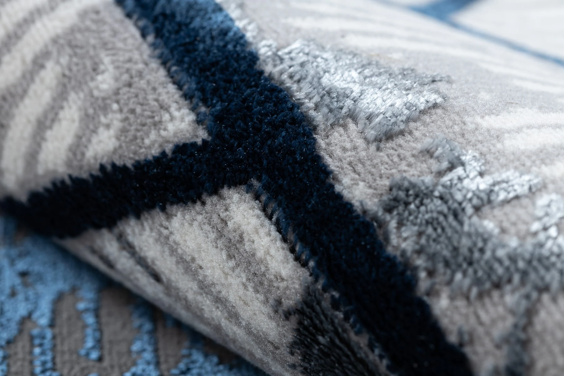 Kremowo-granatowy dywan z geometrycznym wzorem, który doda salonowi elegancki charakter w klasycznym stylu.