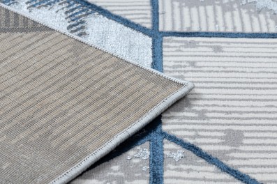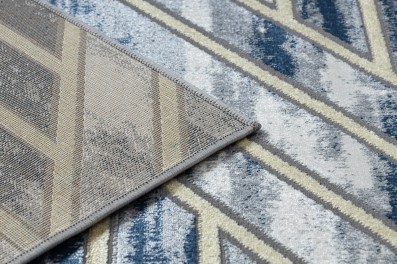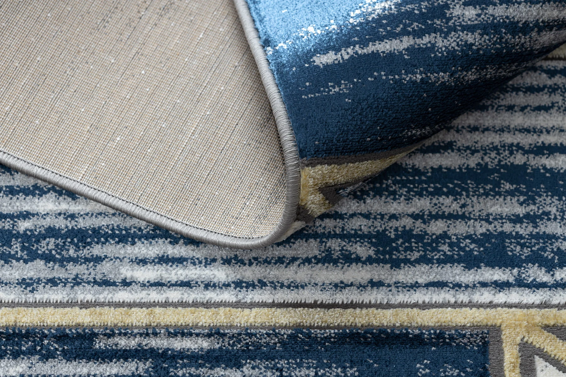 Granatowy dywan z geometrycznym wzorem i złotymi akcentami, który doda salonowi elegancji i stylu.