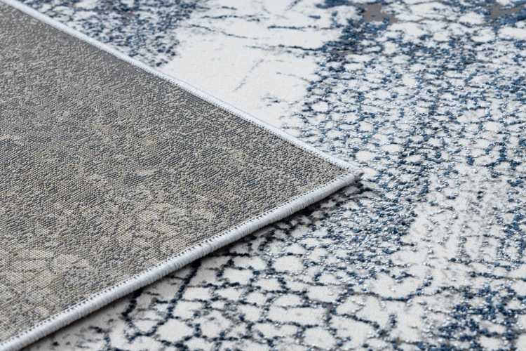 Kremowo-granatowy dywan z abstrakcyjnym wzorem, który doskonale wpisze się w nowoczesny salon lub pokój.