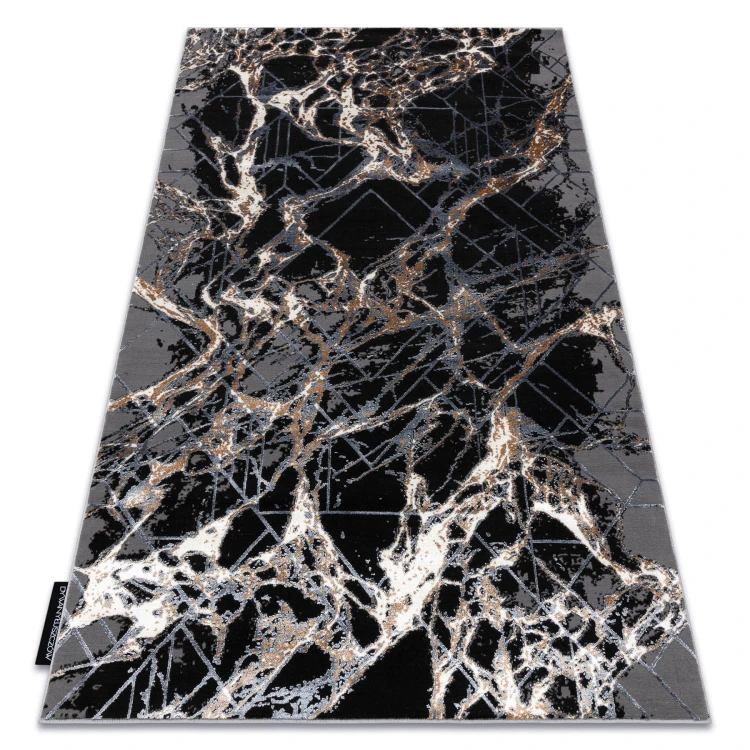 Szary dywan z abstrakcyjnym wzorem w złocistych akcentach, który nada wnętrzu elegancki i nowoczesny charakter.