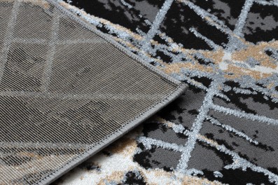 Szary dywan z abstrakcyjnym wzorem w złocistych akcentach, który nada wnętrzu elegancki i nowoczesny charakter.