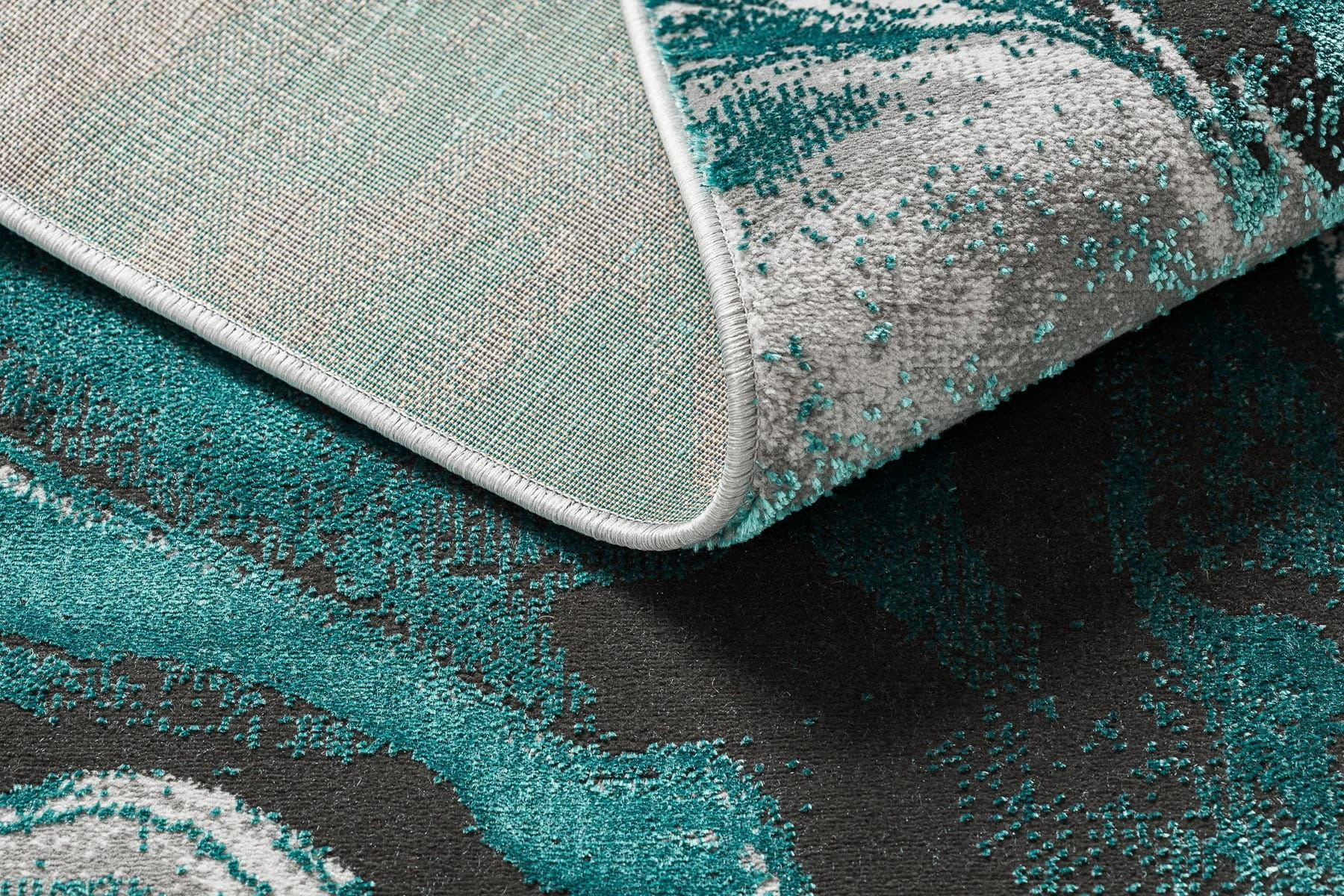 Turkusowy dywan z abstrakcyjnym wzorem, który wprowadzi do wnętrza świeży, nowoczesny akcent.