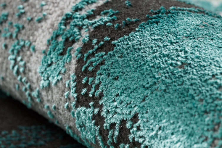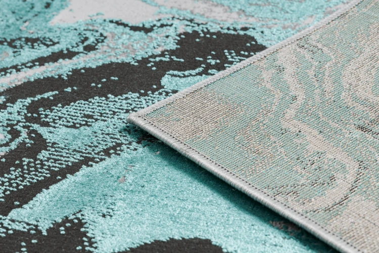 Turkusowy dywan z abstrakcyjnym wzorem, który wprowadzi do wnętrza świeży, nowoczesny akcent.