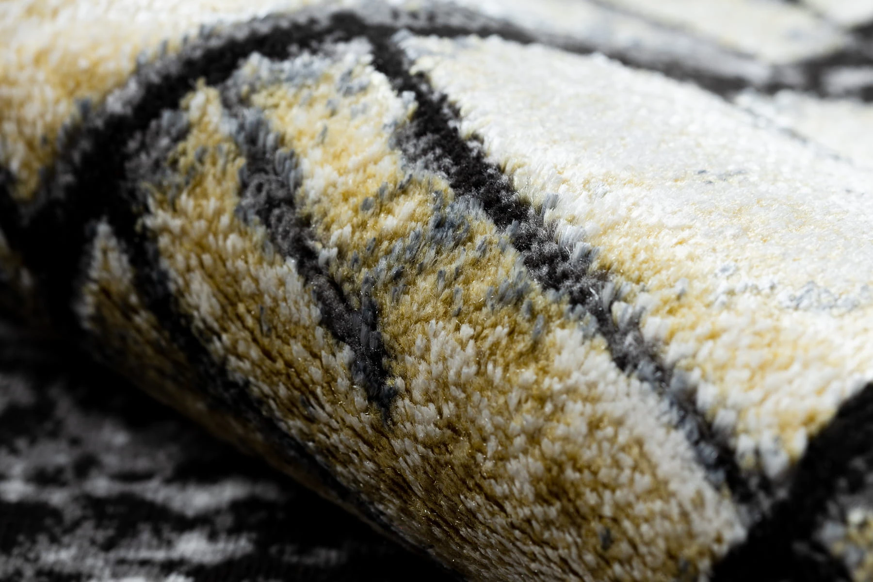 Złoto-szary dywan z abstrakcyjnym wzorem kostek, który wprowadzi do salonu nowoczesny akcent i elegancję.