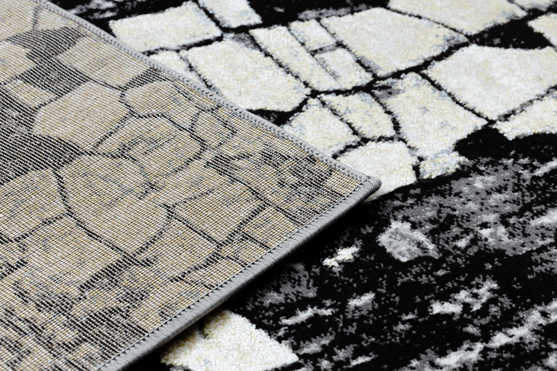 Złoto-szary dywan z abstrakcyjnym wzorem kostek, który wprowadzi do salonu nowoczesny akcent i elegancję.