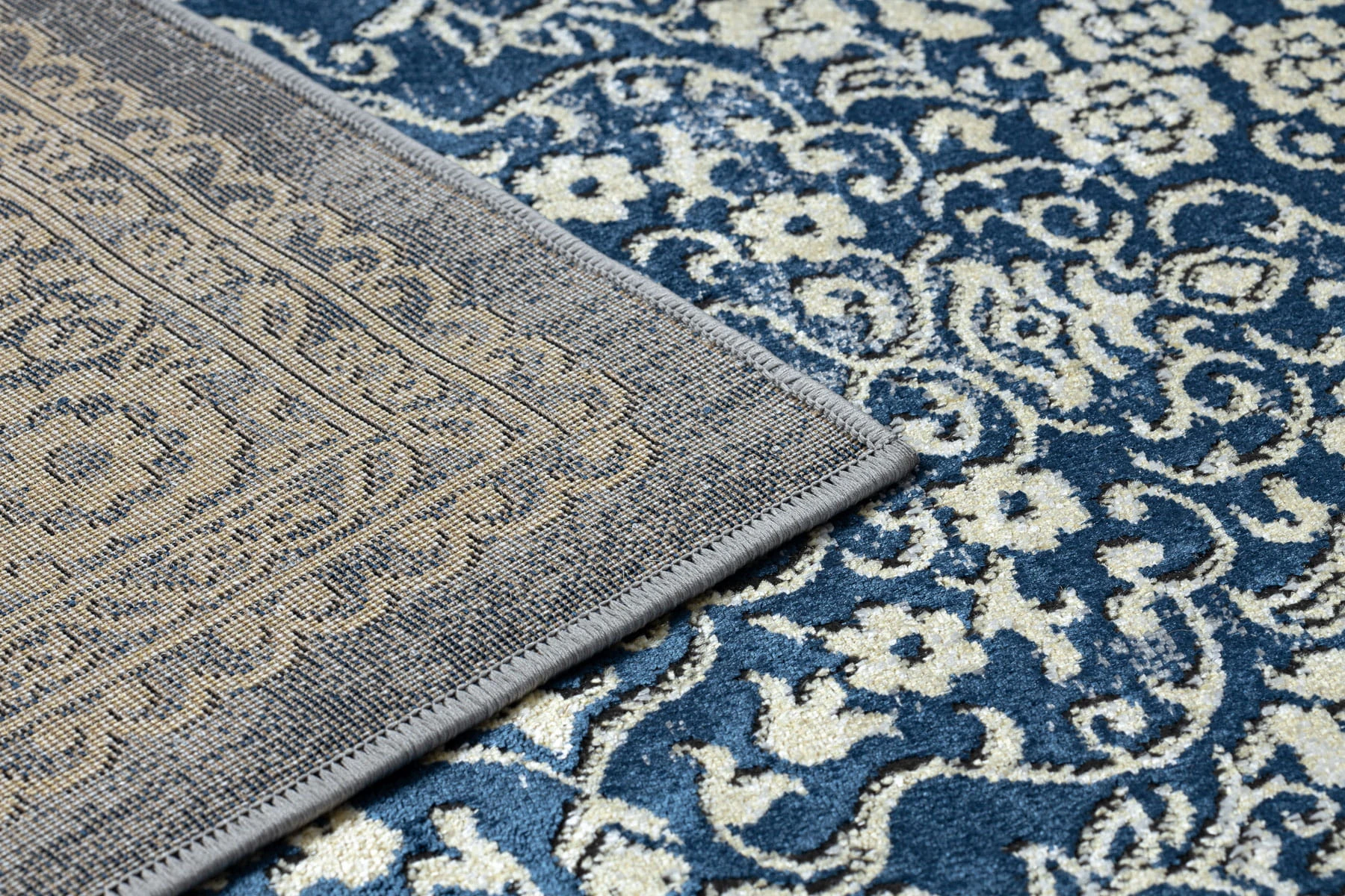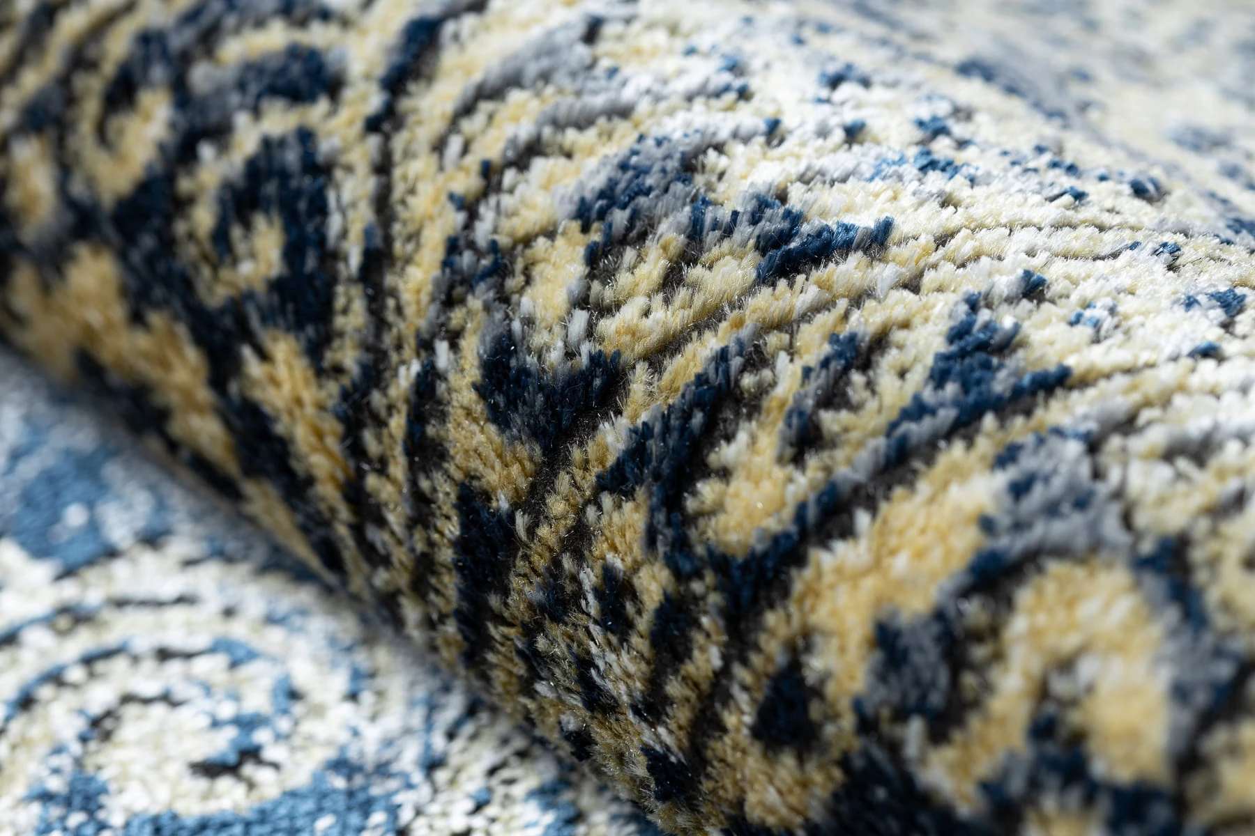 Granatowy dywan z abstrakcyjnym wzorem w złocistych akcentach, który nada wnętrzu elegancki i wyrazisty charakter.