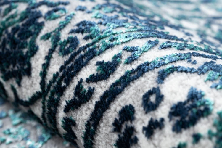 Niebieski dywan z abstrakcyjnym wzorem, który doda wnętrzu nowoczesny charakter i świeży akcent kolorystyczny.