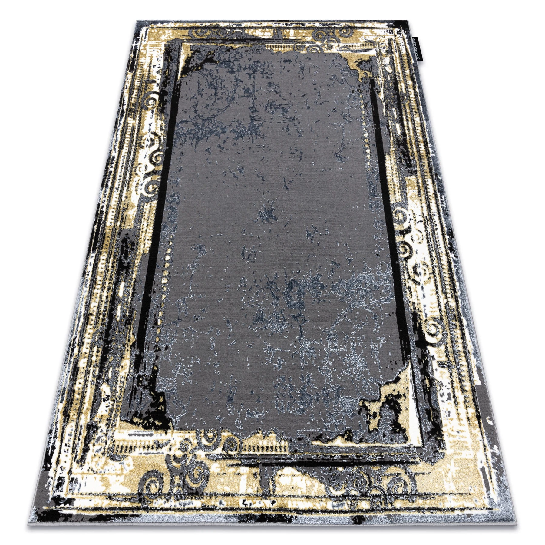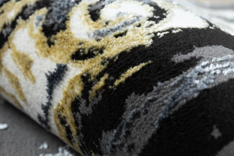 Szary dywan z eleganckim złotym wzorem, który nada salonowi wyrafinowany charakter.