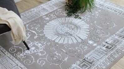 Szary dywan z eleganckim złotym wzorem, który nada salonowi wyrafinowany charakter.