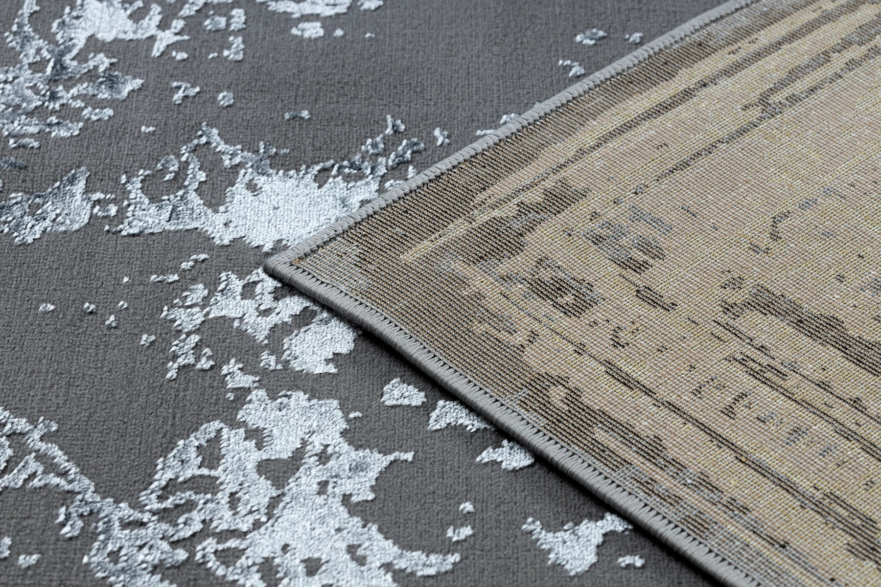 Szary dywan z eleganckim złotym wzorem, który nada salonowi wyrafinowany charakter.