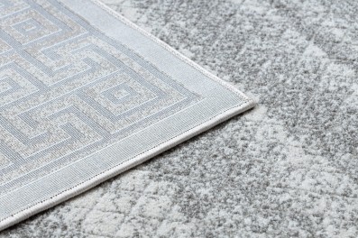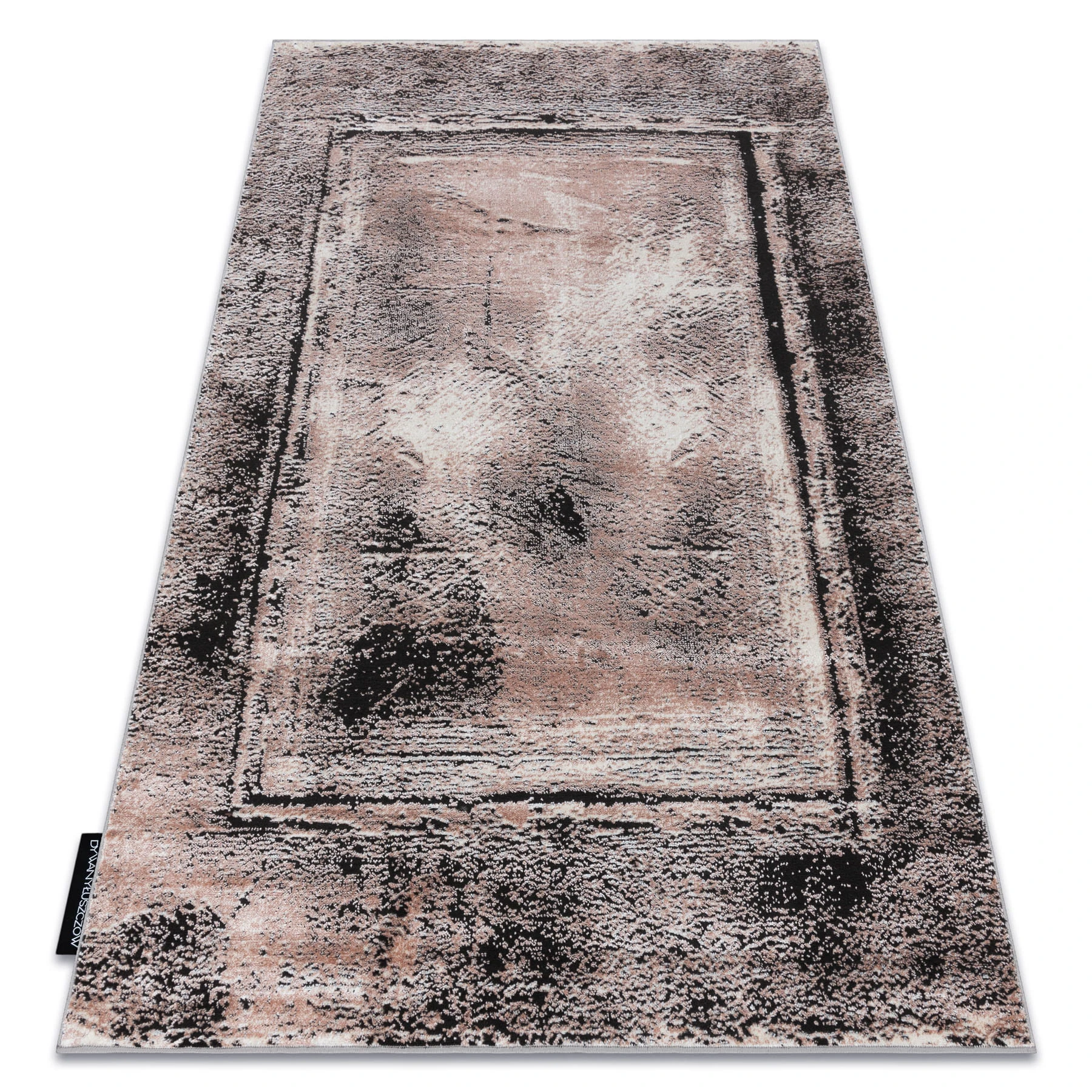 Szary dywan z delikatną różową ramką, który doskonale sprawdzi się w salonie, dodając wnętrzu subtelnego charakteru.