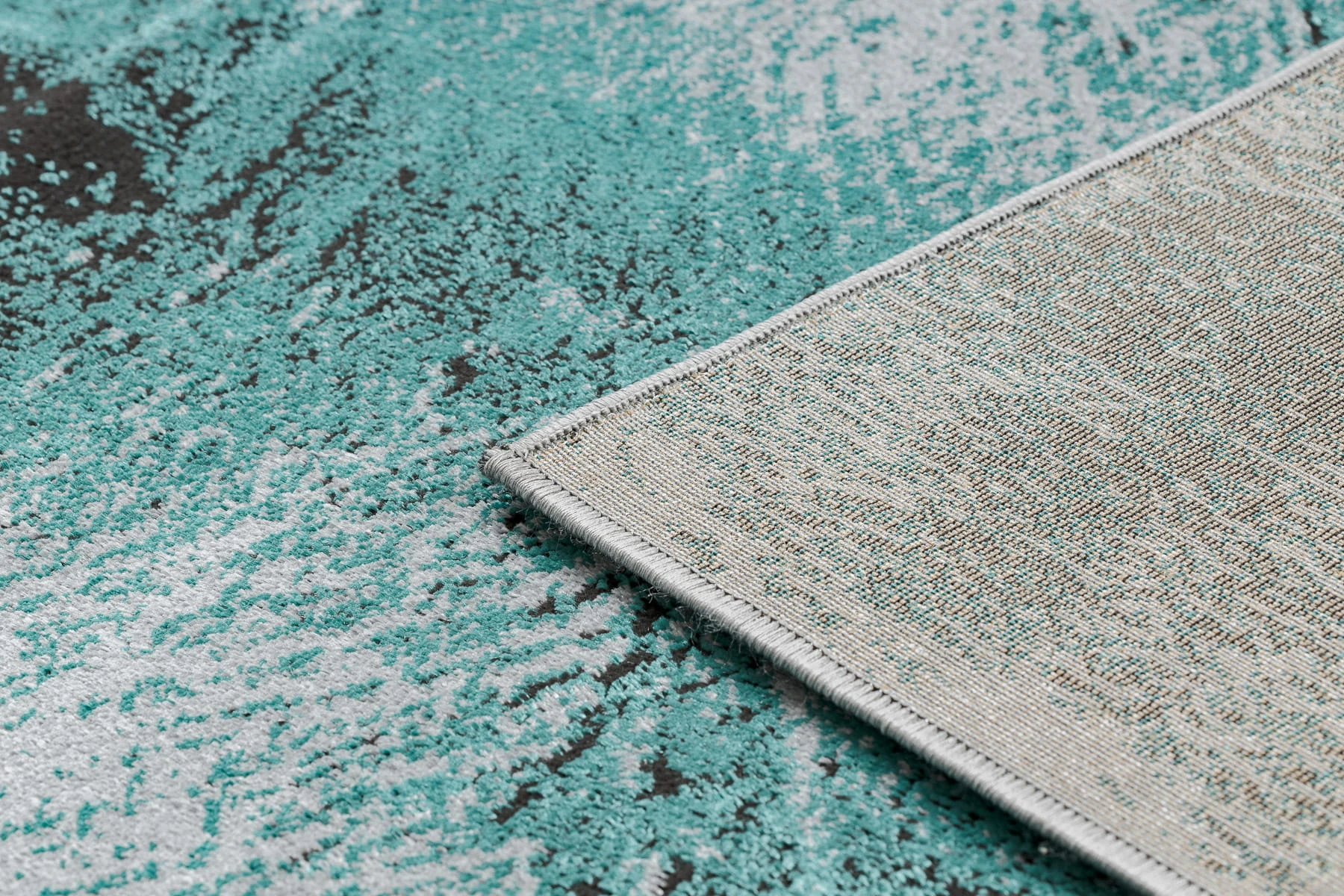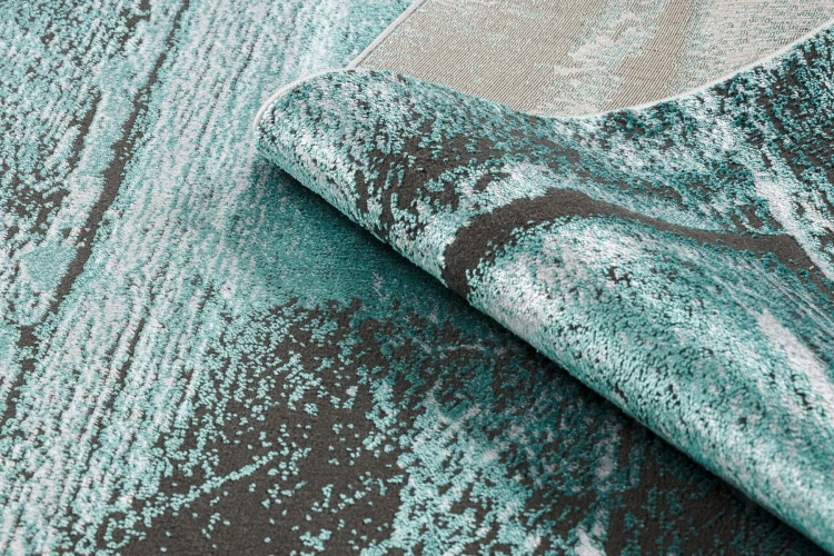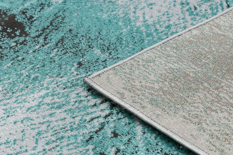 Turkusowy dywan z elegancką ramką, który doda wnętrzu świeży akcent kolorystyczny i nowoczesny charakter.