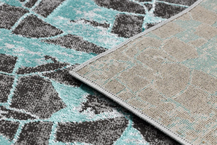 Turkusowy dywan z abstrakcyjnym wzorem, który wniesie do salonu świeży, energetyczny akcent kolorystyczny.