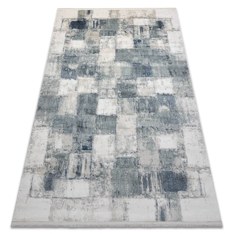 Szary dywan z geometrycznym wzorem, który doskonale sprawdzi się w korytarzu, nadając mu nowoczesny charakter.