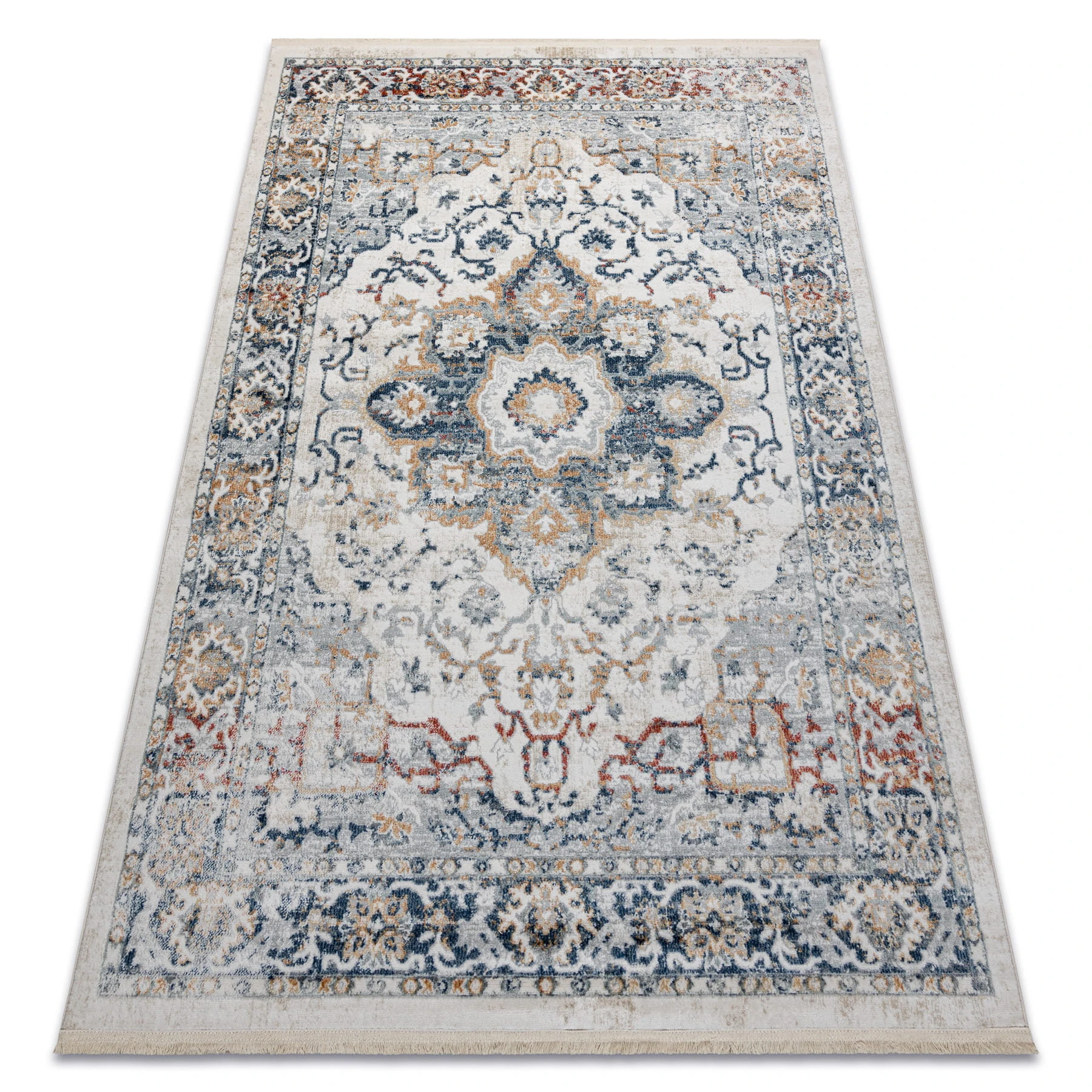 Niebieski dywan z wielokolorowym tradycyjnym wzorem, który ożywi korytarz eleganckim ornamentem i nada mu klasyczny charakter.
