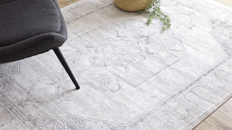 Szary dywan z abstrakcyjnym wzorem w odcieniach jasnoszarości, który doskonale wpisze się w nowoczesne wnętrza salonu lub pokoju.