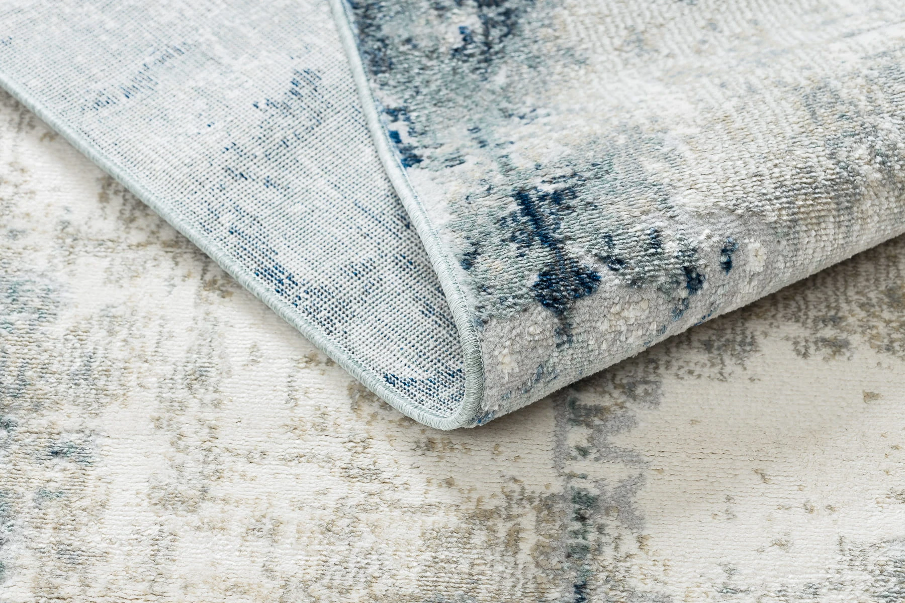 Niebieski dywan z abstrakcyjnym wzorem ramki, który wprowadzi do salonu spokojny, nowoczesny charakter.