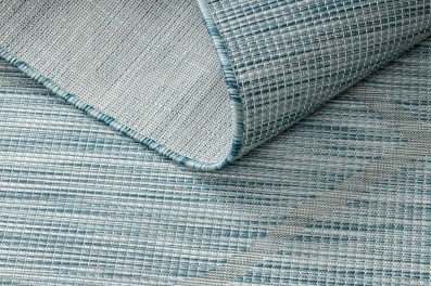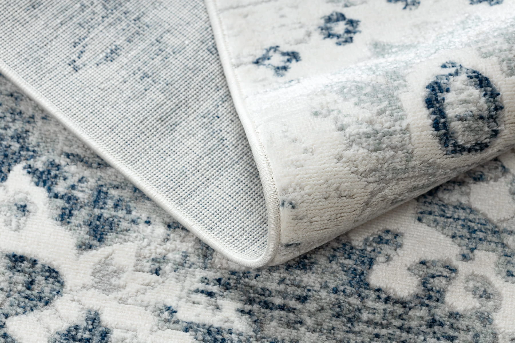 Niebieski dywan z abstrakcyjnym wzorem, który wniesie do salonu nowoczesny charakter i subtelny kolorowy akcent.