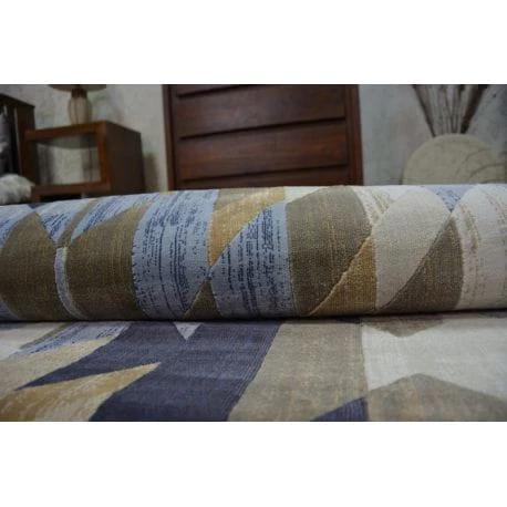 Złoty dywan z abstrakcyjnym wzorem, który wniesie do salonu lub pokoju ciepły, luksusowy akcent.