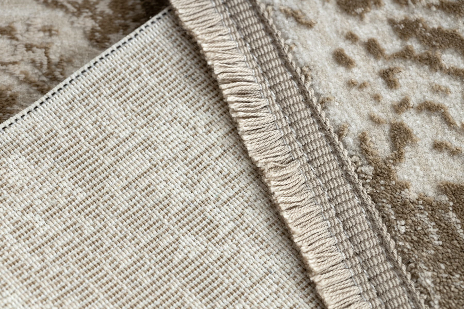 Beżowy dywan z abstrakcyjnym wzorem geometrycznym, który doskonale sprawdzi się w korytarzu, dodając mu nowoczesnego charakteru.