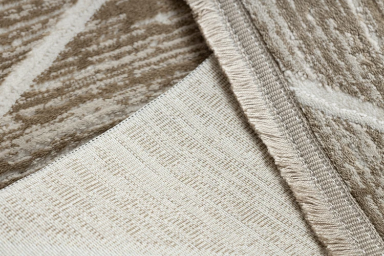 Beżowo-kremowy dywan z geometrycznym wzorem, który wprowadzi do salonu harmonię i nowoczesny charakter.