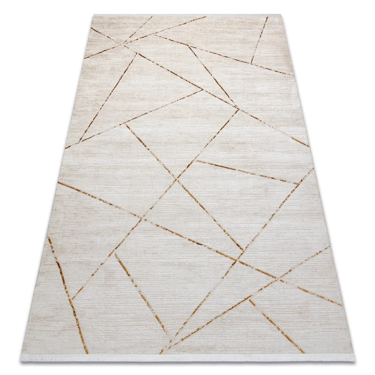 Kremowo-złoty dywan z geometrycznym wzorem, który doda salonowi eleganckiej ciepłoty i nowoczesnego charakteru.