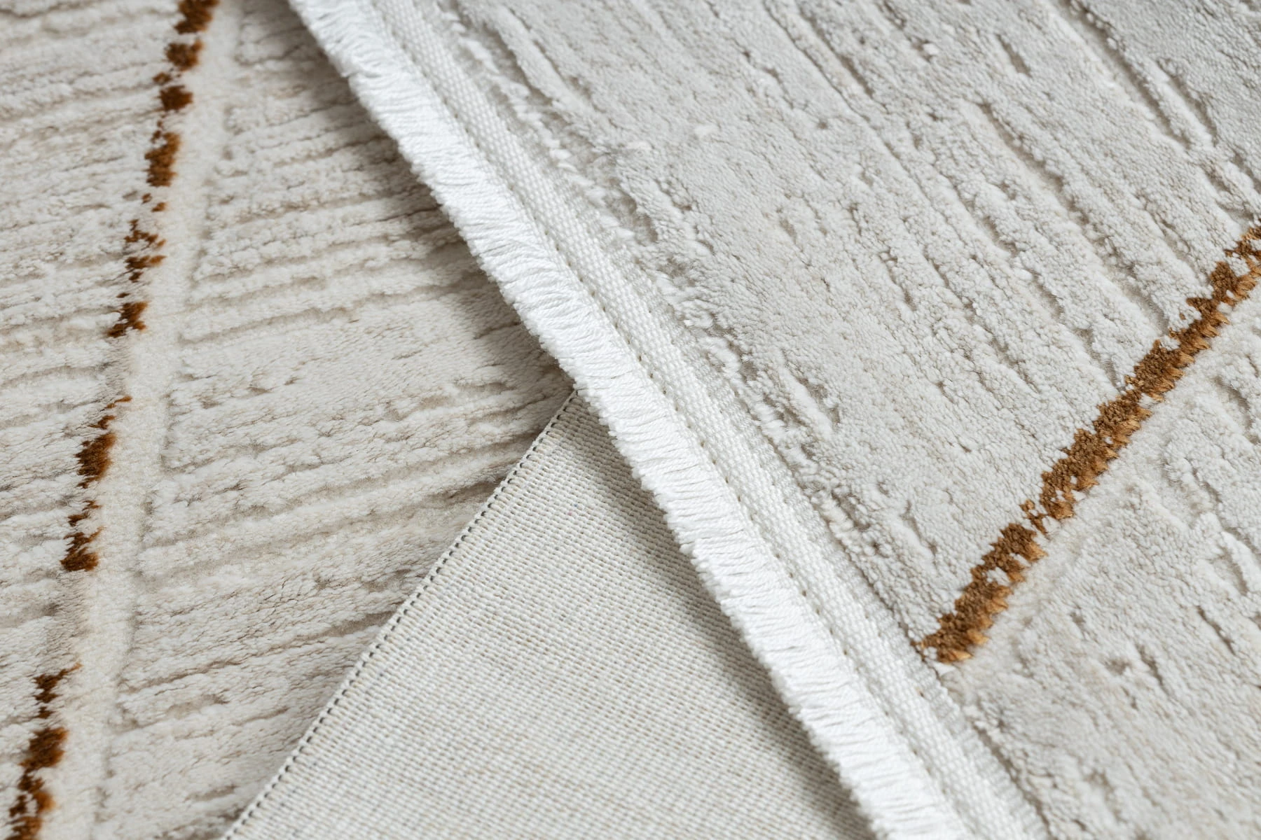 Kremowo-złoty dywan z geometrycznym wzorem, który doda salonowi eleganckiej ciepłoty i nowoczesnego charakteru.