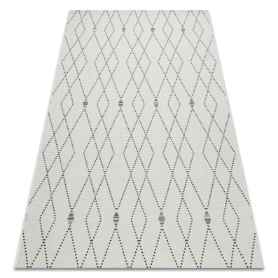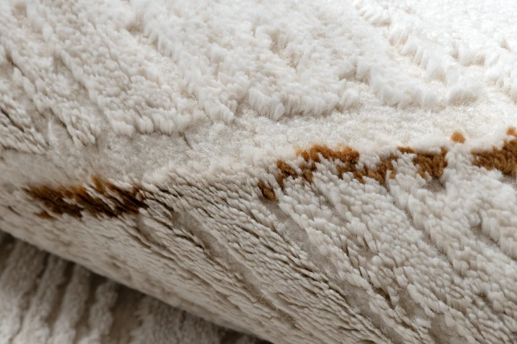 Kremowo-złoty dywan z geometrycznym wzorem, który elegancko wypełni korytarz, dodając mu ciepłego charakteru.