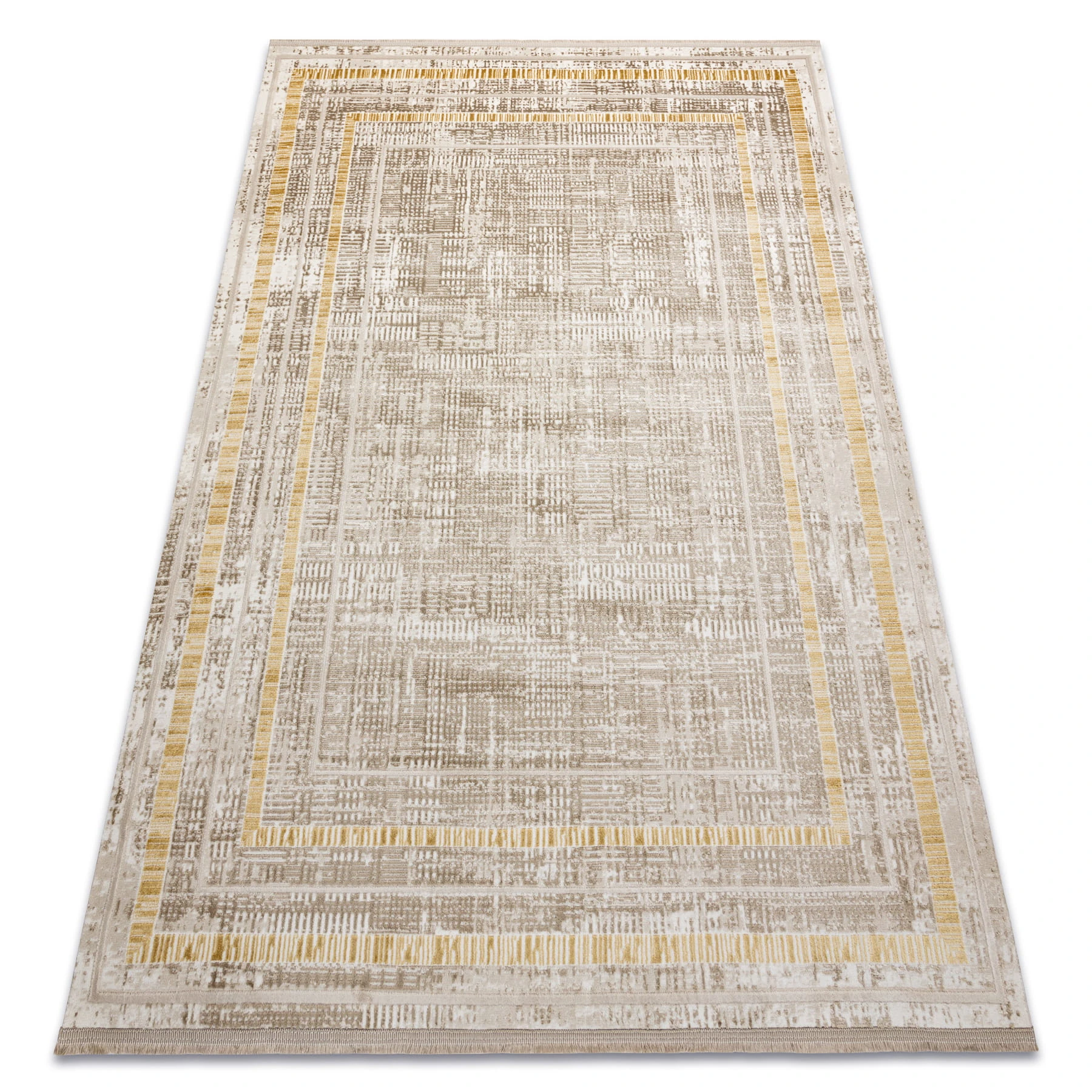 Beżowy dywan z elegancką ramką w złotych odcieniach, który doda salonowi ciepła i klasycznego charakteru.