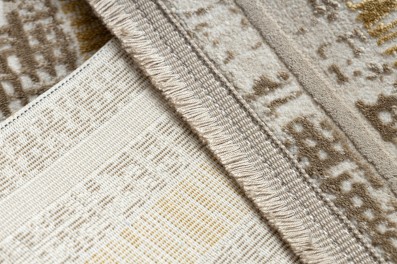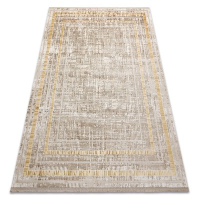 Beżowy dywan z elegancką złotą ramką, który doskonale sprawdzi się w korytarzu, nadając mu klasyczny charakter.