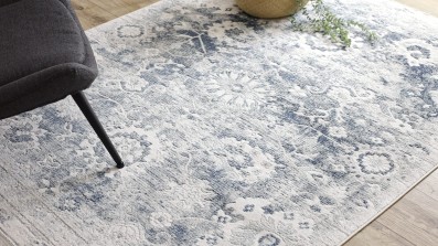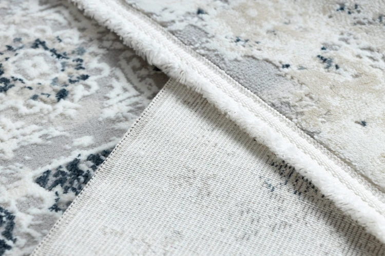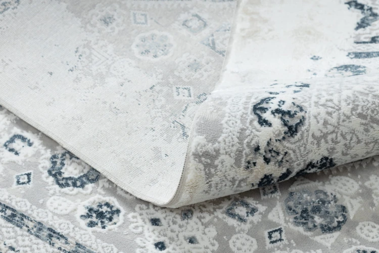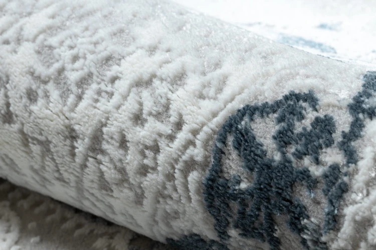 Kremowo-niebieski dywan z abstrakcyjnym wzorem, który wprowadzi do salonu świeży, nowoczesny akcent.