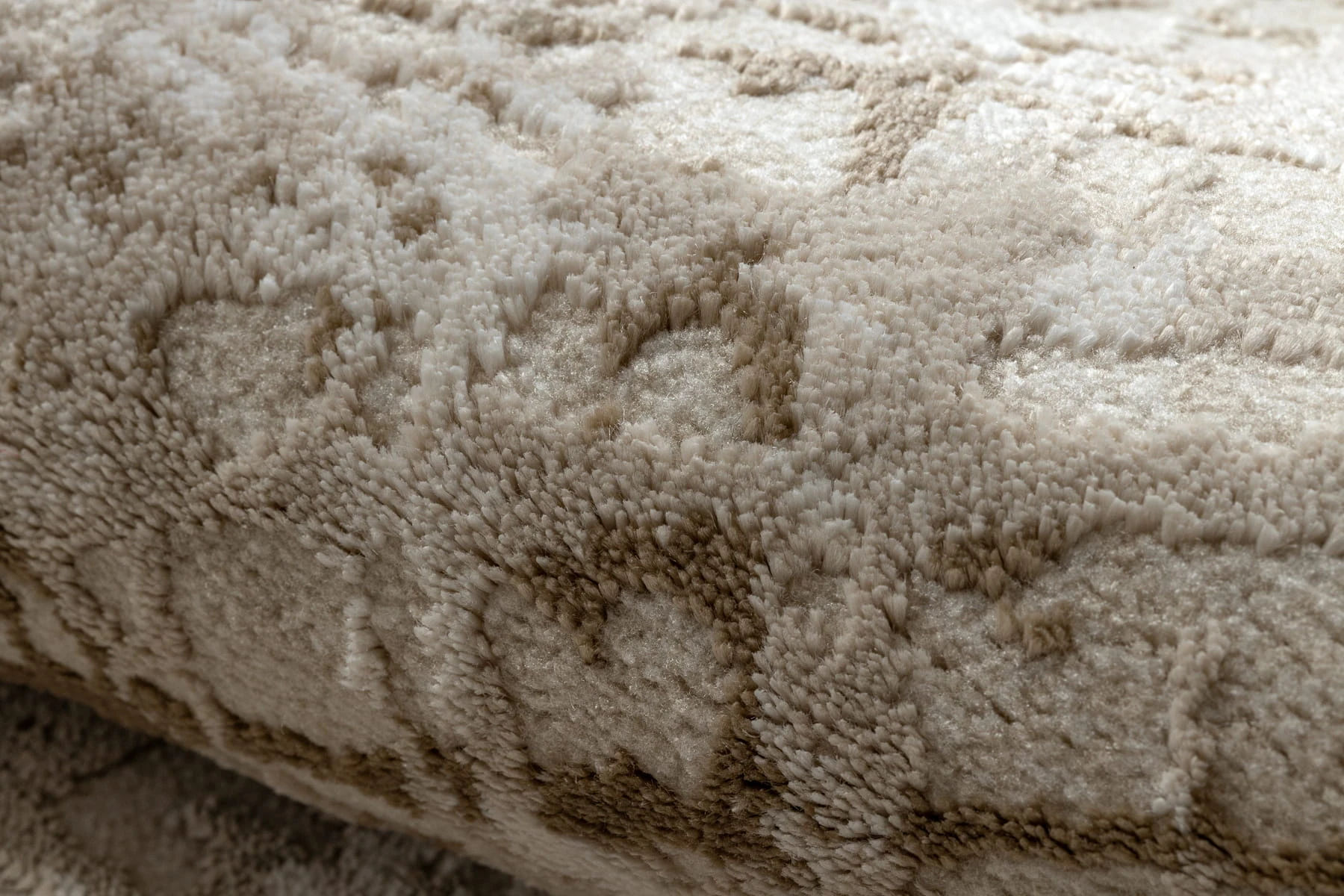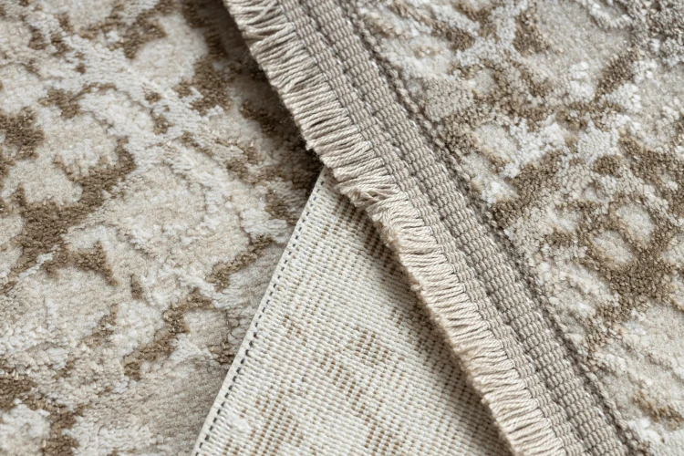 Beżowo-kremowy dywan z abstrakcyjnym wzorem, który doskonale wpisze się w nowoczesny salon lub pokój.