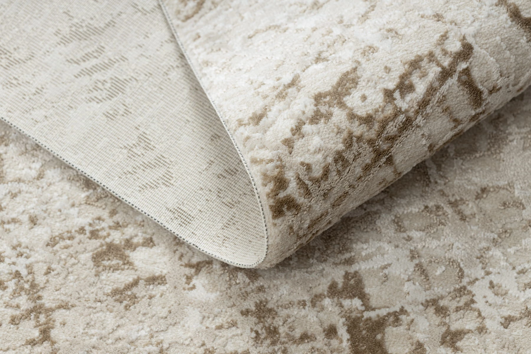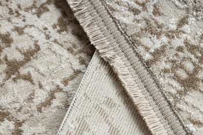 Beżowy dywan z abstrakcyjnym wzorem, który doskonale wypełni korytarz, tworząc ciepłą atmosferę w stonowanych odcieniach.