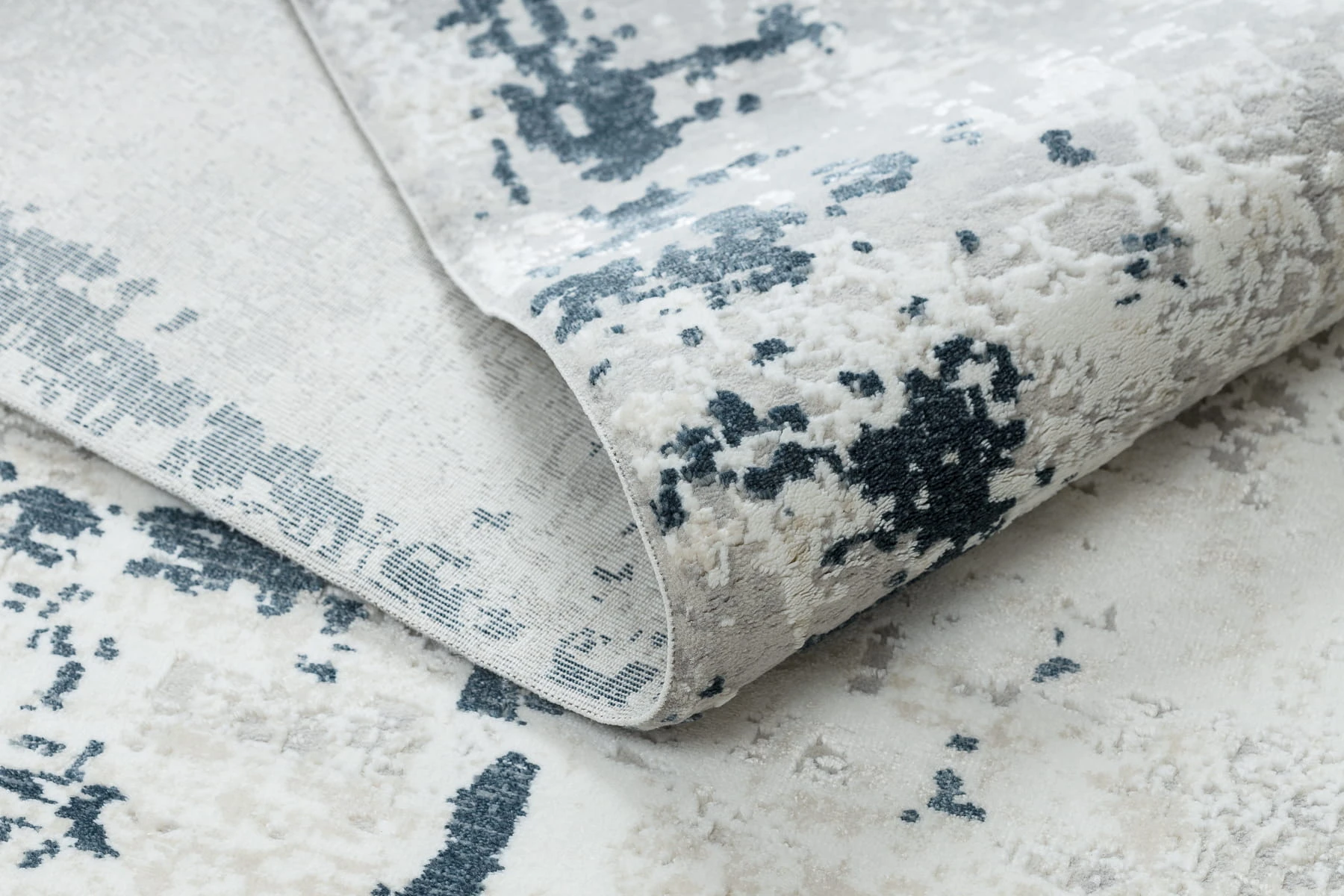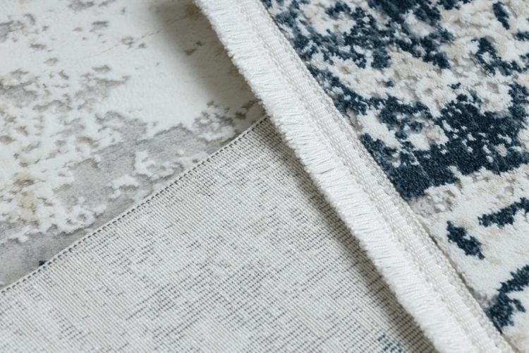 Kremowo-niebieski dywan z abstrakcyjnym wzorem, który doskonale sprawdzi się w salonie, nadając mu nowoczesny charakter.