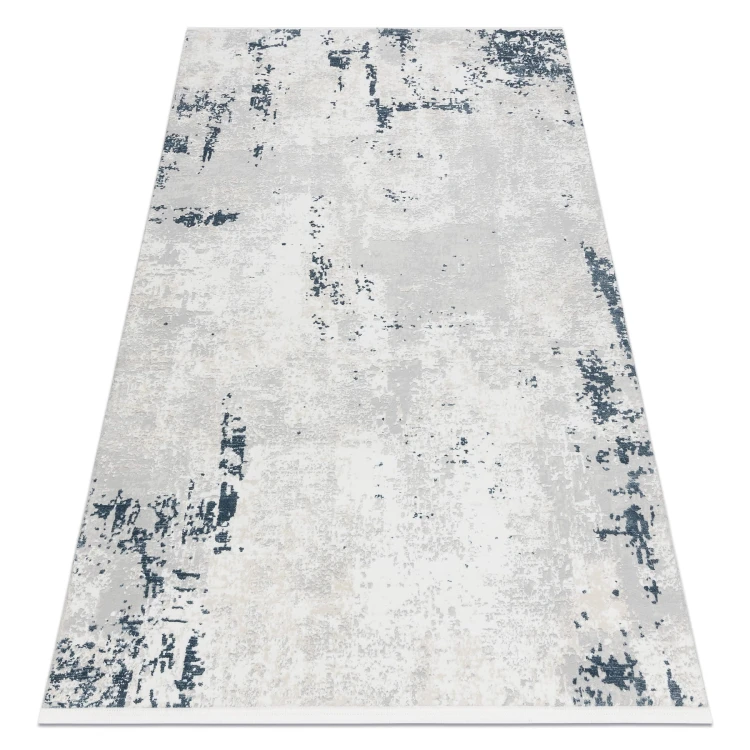 Kremowo-niebieski dywan z abstrakcyjnym wzorem, który doskonale sprawdzi się w salonie, nadając mu nowoczesny charakter.
