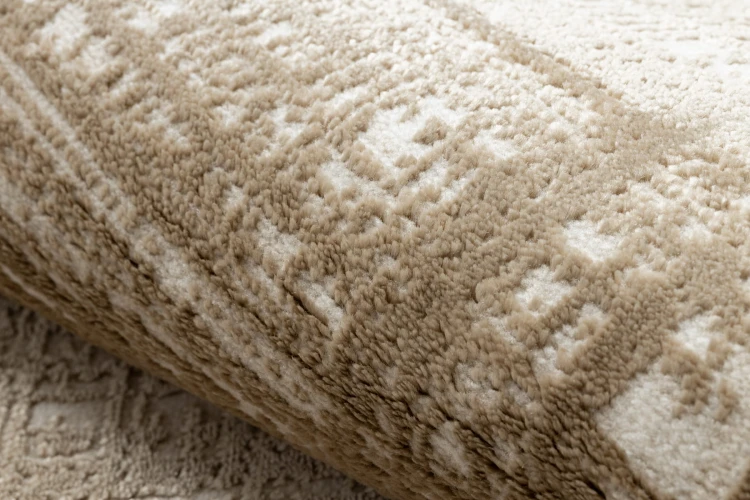 Beżowy dywan z abstrakcyjnym wzorem, który doskonale wpisze się w nowoczesne wnętrza, dodając im ciepła i elegancji.