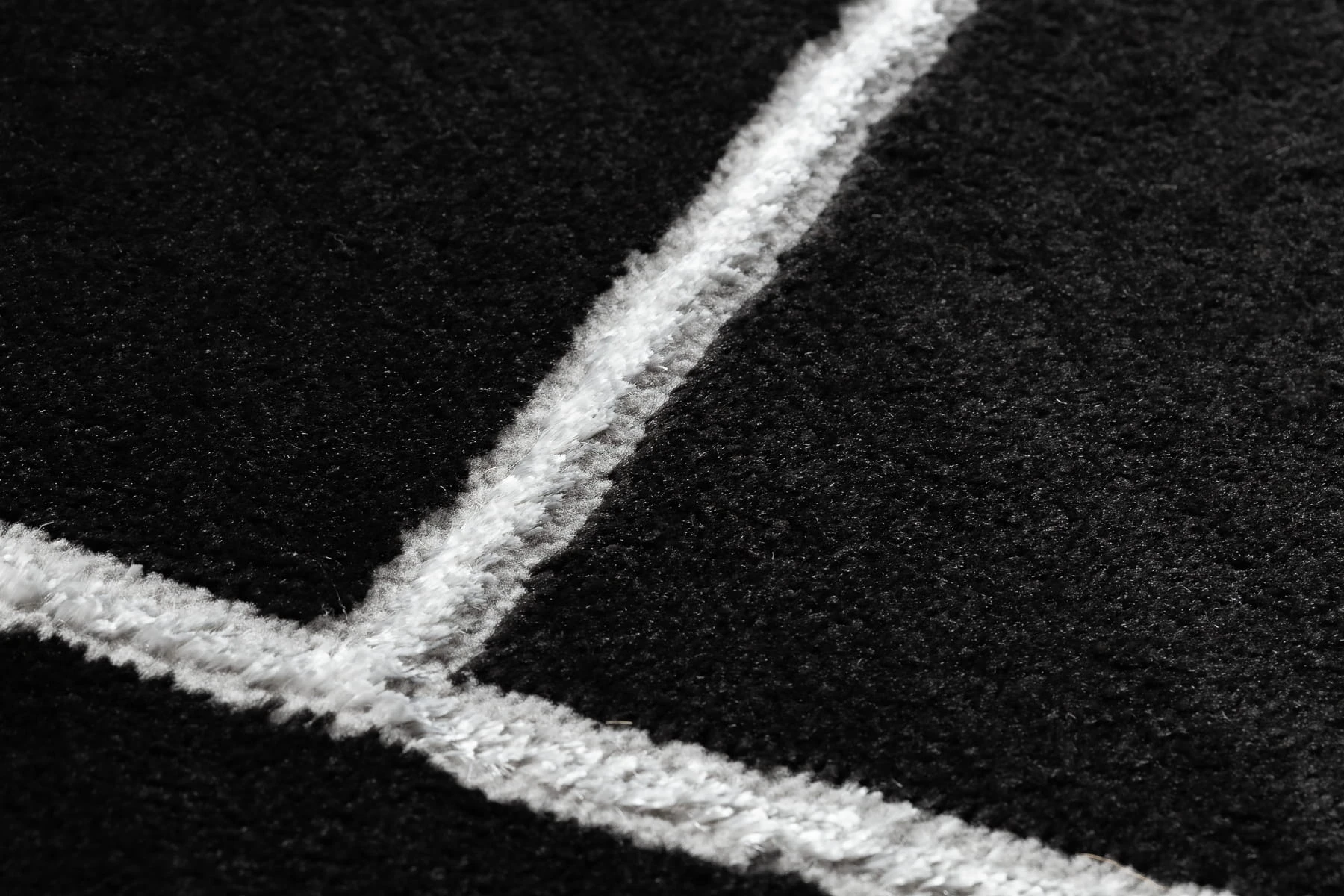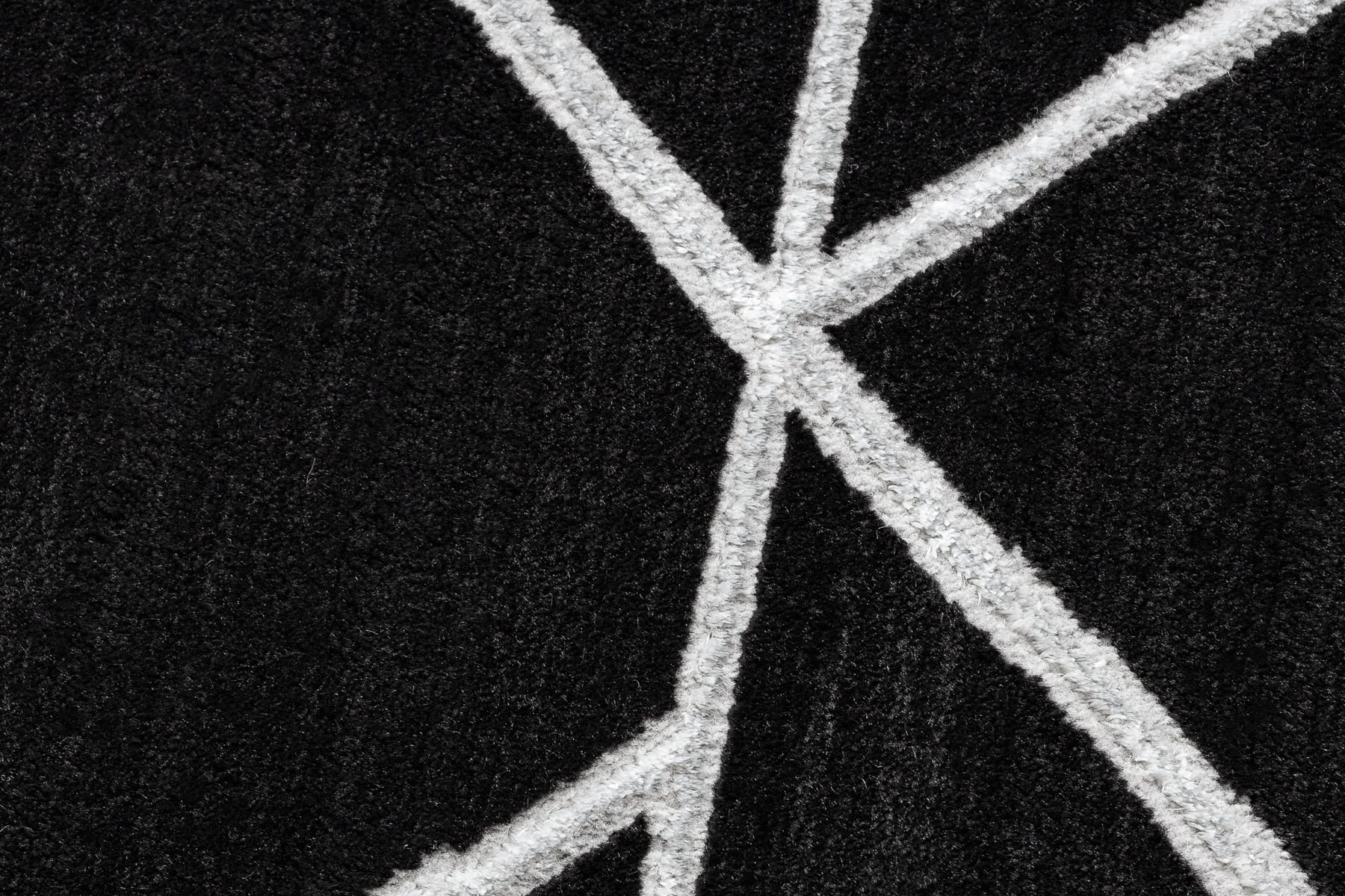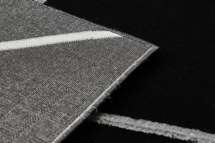 Czarno-srebrny dywan z geometrycznym wzorem, który doda salonowi nowoczesny i elegancki charakter.