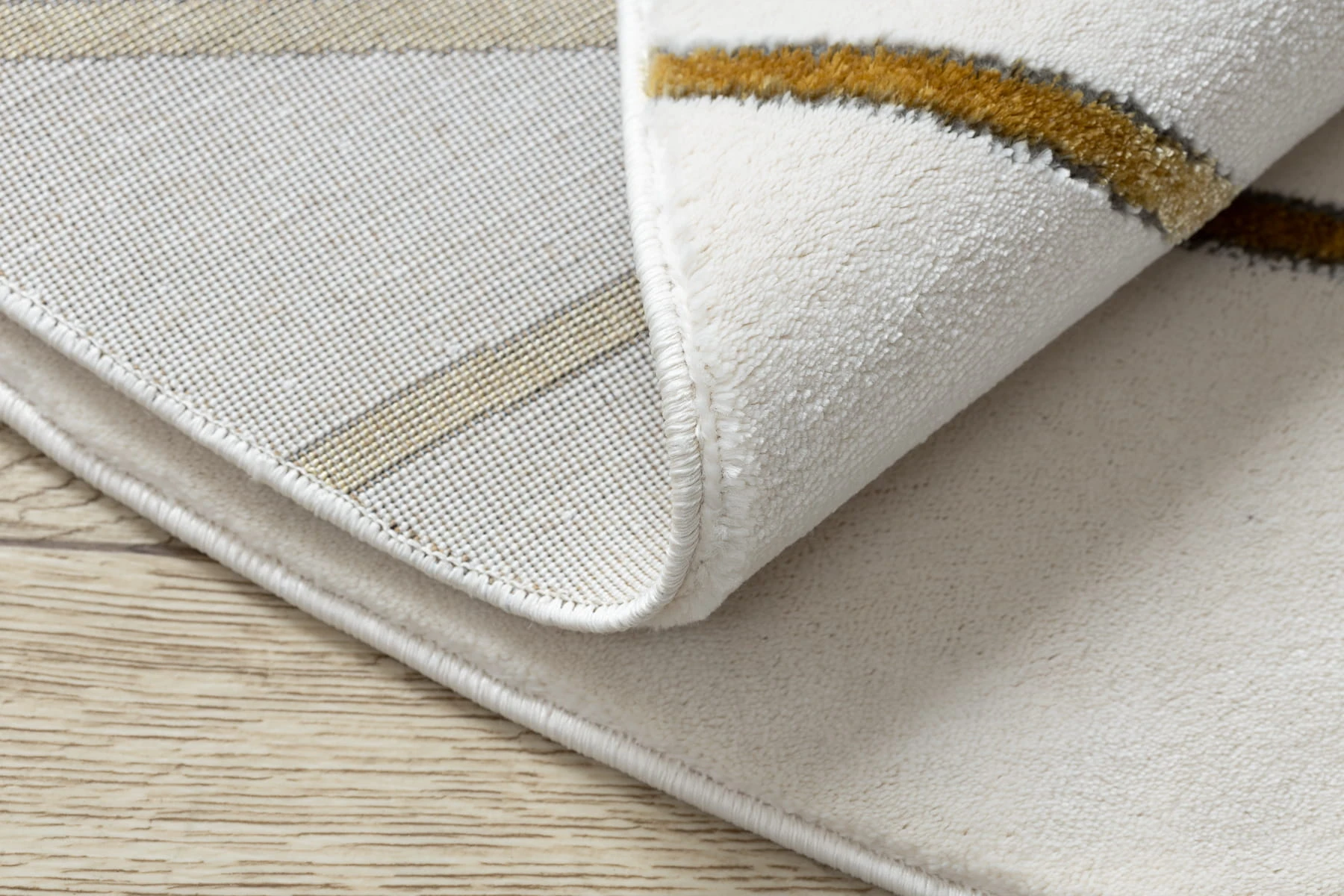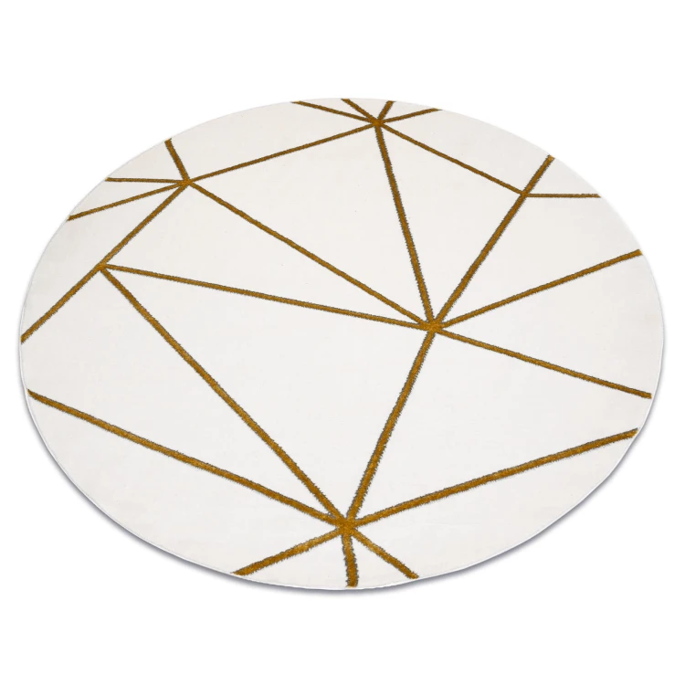 Okrągły dywan w ciepłych odcieniach kremu ze złotymi akcentami i geometrycznym wzorem, który doda salonowi elegancki charakter.