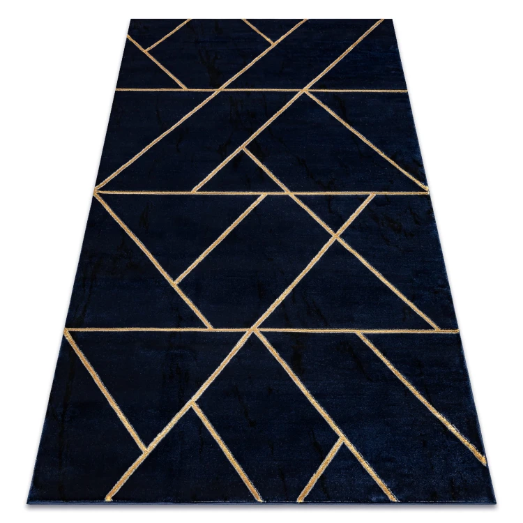 Granatowy dywan z geometrycznym wzorem i złotymi akcentami, który nada salonowi elegancki charakter z nutą nowoczesności.