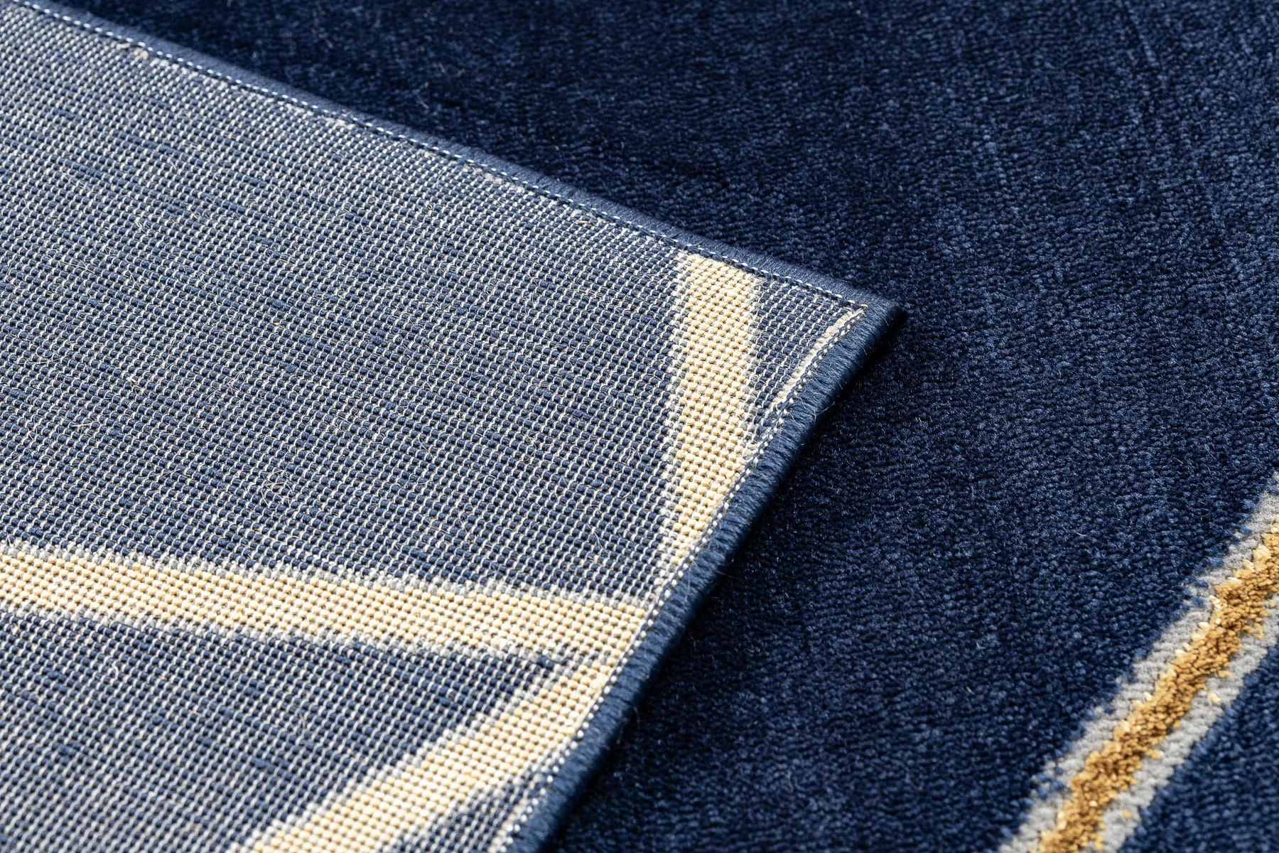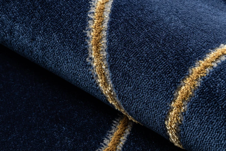 Granatowy dywan z geometrycznym wzorem w złocistych odcieniach, który doda salonowi eleganckiego charakteru i wyrazistości.