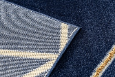 Granatowy dywan z geometrycznym wzorem i złotymi akcentami, który nada salonowi elegancki charakter z nutą nowoczesności.