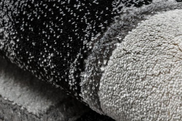 Szary dywan z geometrycznym wzorem marmurkowym, który doda salonowi nowoczesny charakter i elegancki akcent.