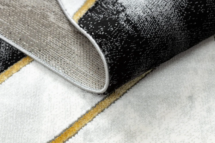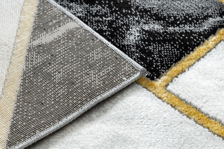 Czarno-złoty dywan z geometrycznym wzorem, który doda salonowi luksusowy charakter i stanie się efektownym punktem centralnym wnętrza.