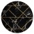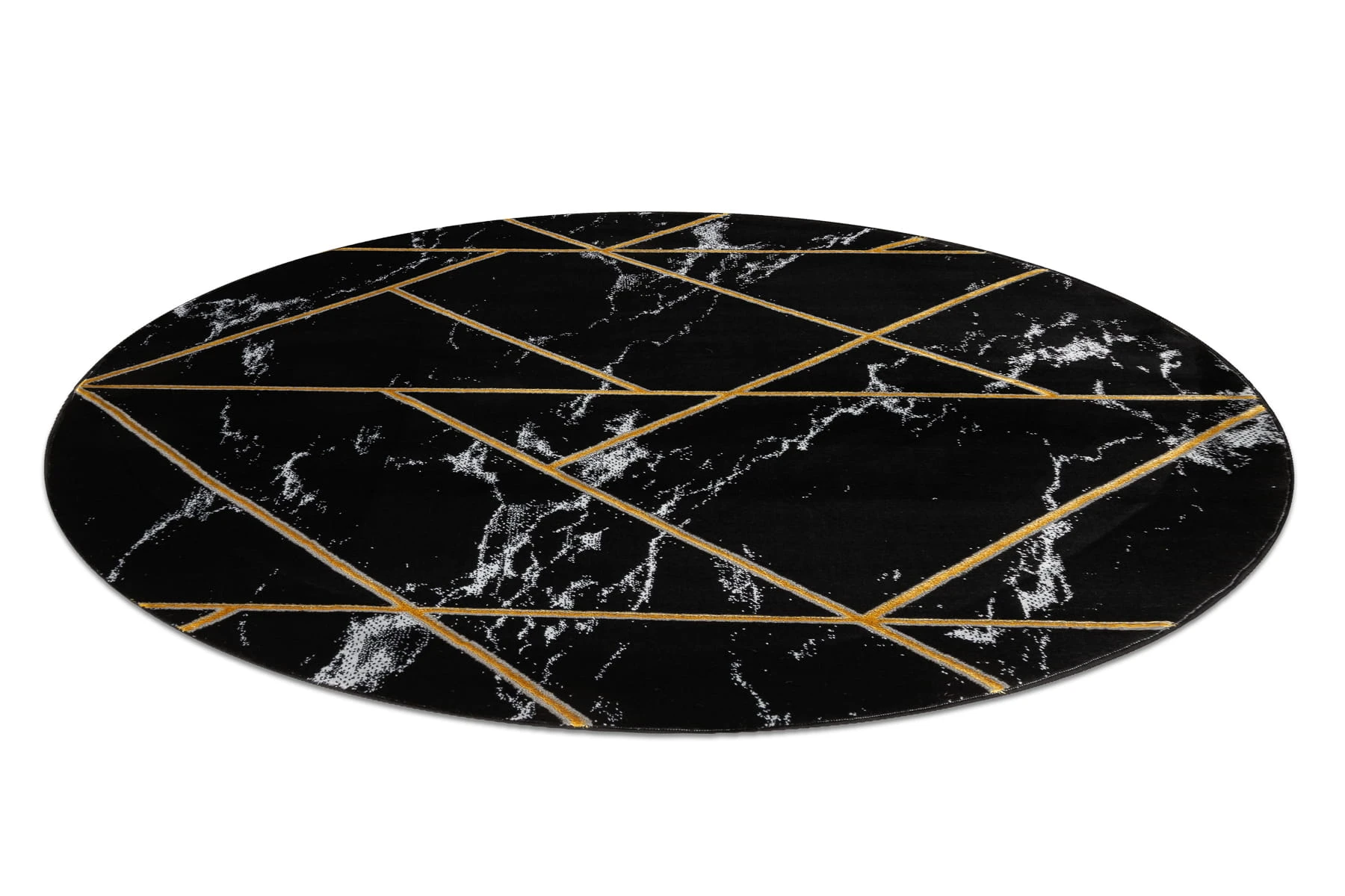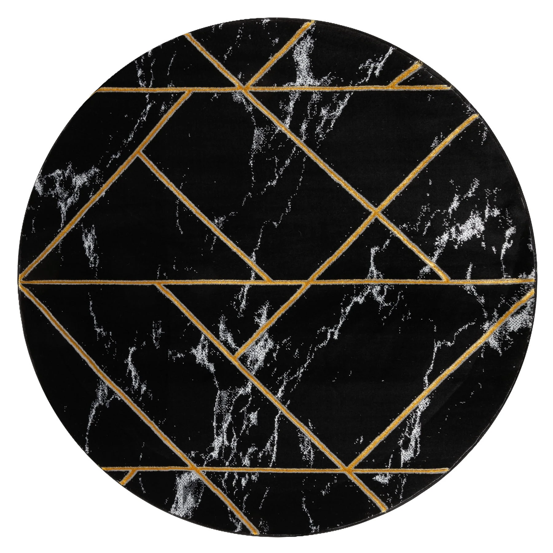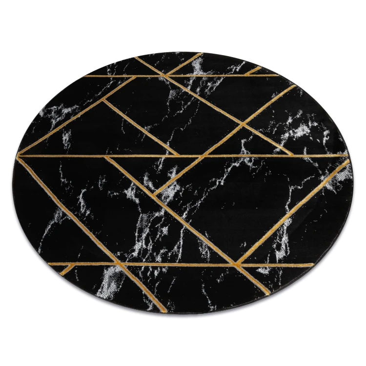 Okrągły dywan w czerni ze złotymi akcentami i geometrycznym wzorem marmuru, który doda salonowi luksusowy charakter.