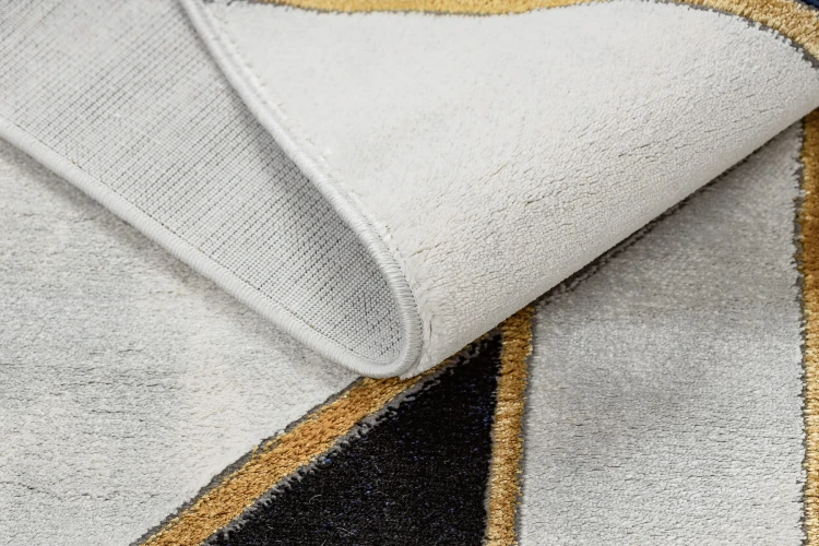 Niebieski dywan ze złotym geometrycznym wzorem, który wprowadzi do wnętrza elegancki i nowoczesny charakter.