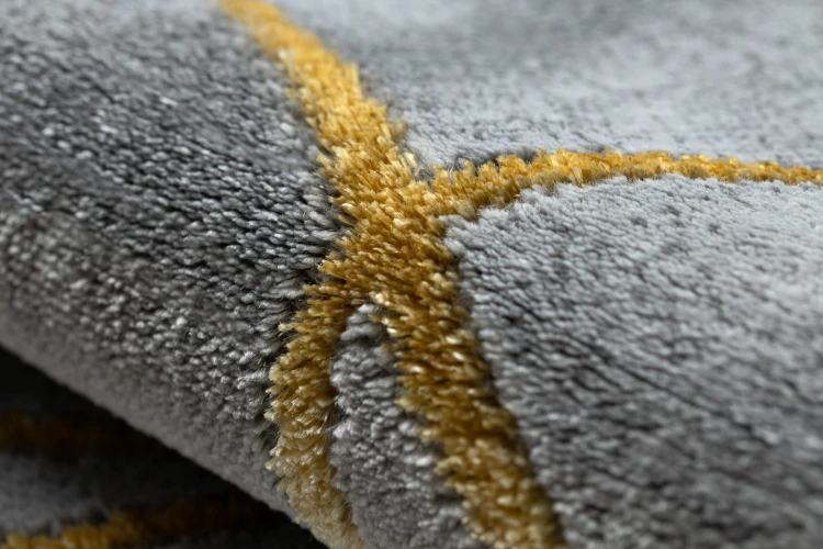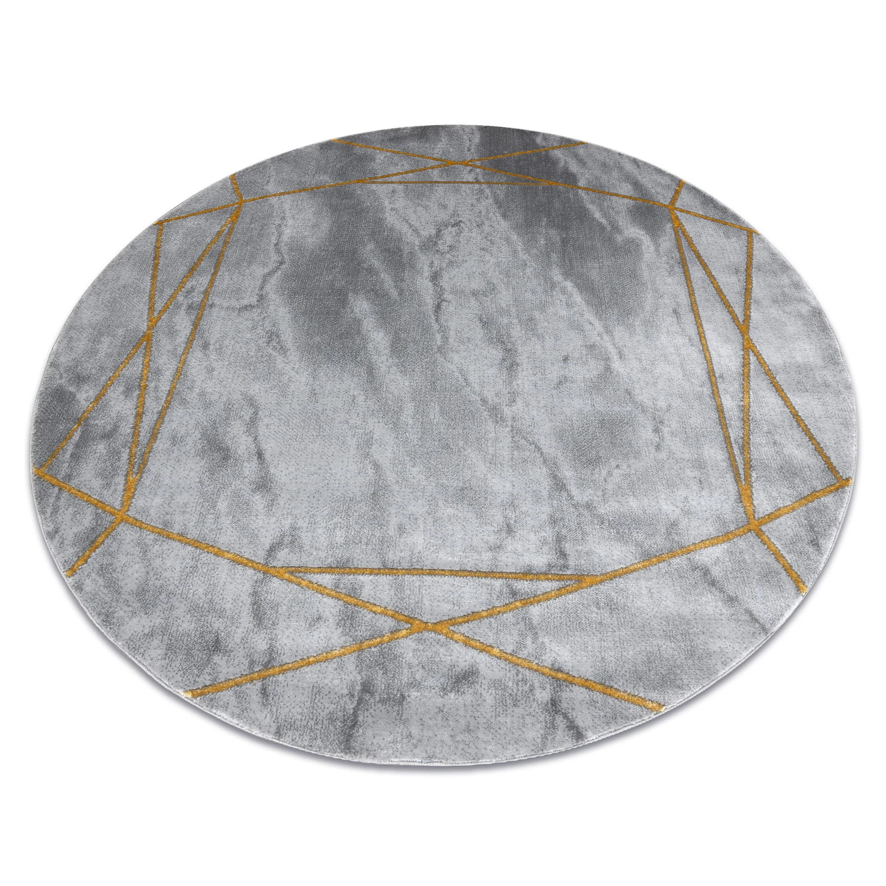 Okrągły dywan w szarości ze złotymi elementami i geometrycznym wzorem, który elegancko uzupełni salon lub pokój.