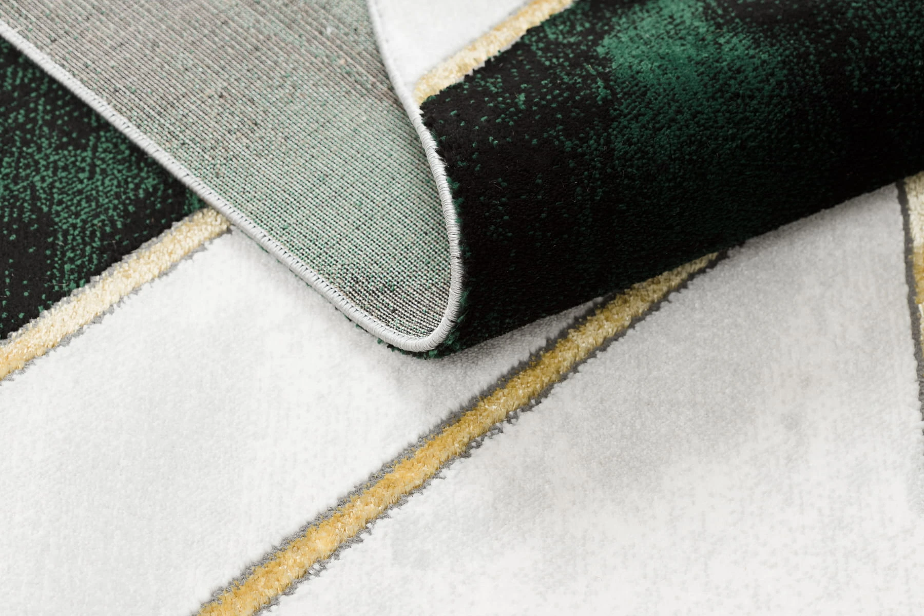 Złoty dywan z geometrycznym wzorem, który doda salonowi elegancki charakter i ciepły blask.
